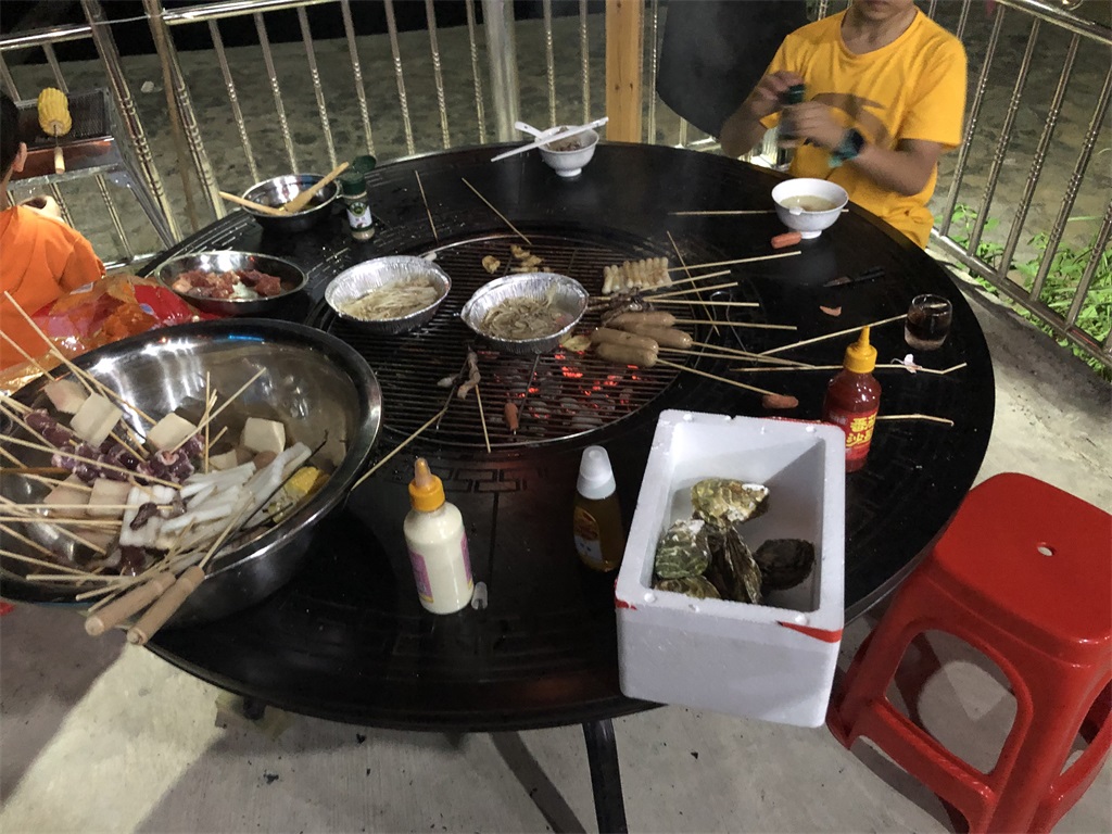 傍晚,摘完果子的朋友们来到山下农家乐架起了烧烤架,拿出餐厅提前备好的食材,一起动手生碳、烤肉,同行的小朋友在旁做着小助手。边烤肉的同时吃着农家土菜享受“土味菜”的鲜美味道。饭桌上大家举杯庆贺二十大的胜利闭幕,聊着二十大胜利闭幕后在以习近平主席为核心的党中央坚强领导下,大家满怀信心、展望未来。席间大家自我介绍、热烈交流,在轻松愉悦的氛围中唱起了流行歌、跳上了交际舞,十分开心热闹。