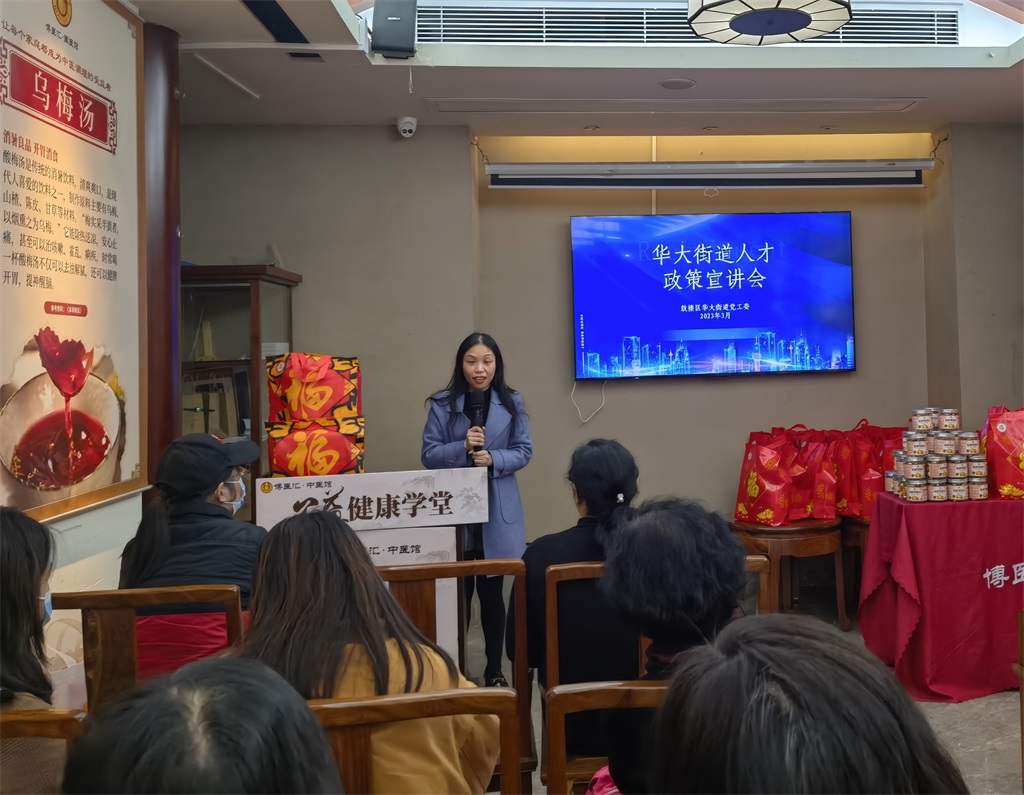 养生讲座结束后,华大街道两新党组织干事严艳和光大银行华林路支行职员,现场为大家进行人才政策讲解并普及惠企政策。