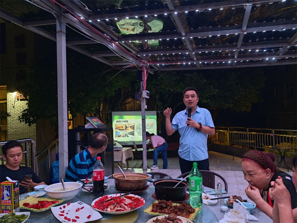 鼓岭不仅拥有着深厚的红色文化和悠久的古厝历史,还是一个气候宜人、风景优美的避暑胜地,商会党支部除了安排学习鼓岭红色教育外,为了更好地增进会员之间的情感和交流,结束学习后在当地民宿安排了轻松愉悦的聚餐。席间,博医汇中医馆的健康形象大使林国栋(商会理事)为大家讲解夏季应该如何保健与养生,教授健身操动作(八段锦)、介绍三伏灸、代茶饮的好处、冰饮对身体的伤害等健康保健知识,丰富了大家对中医养生的认知。聚餐期间众人感受山间清风凉意、欣赏福州夜景、品茶论道、对酒当歌,好不热闹。