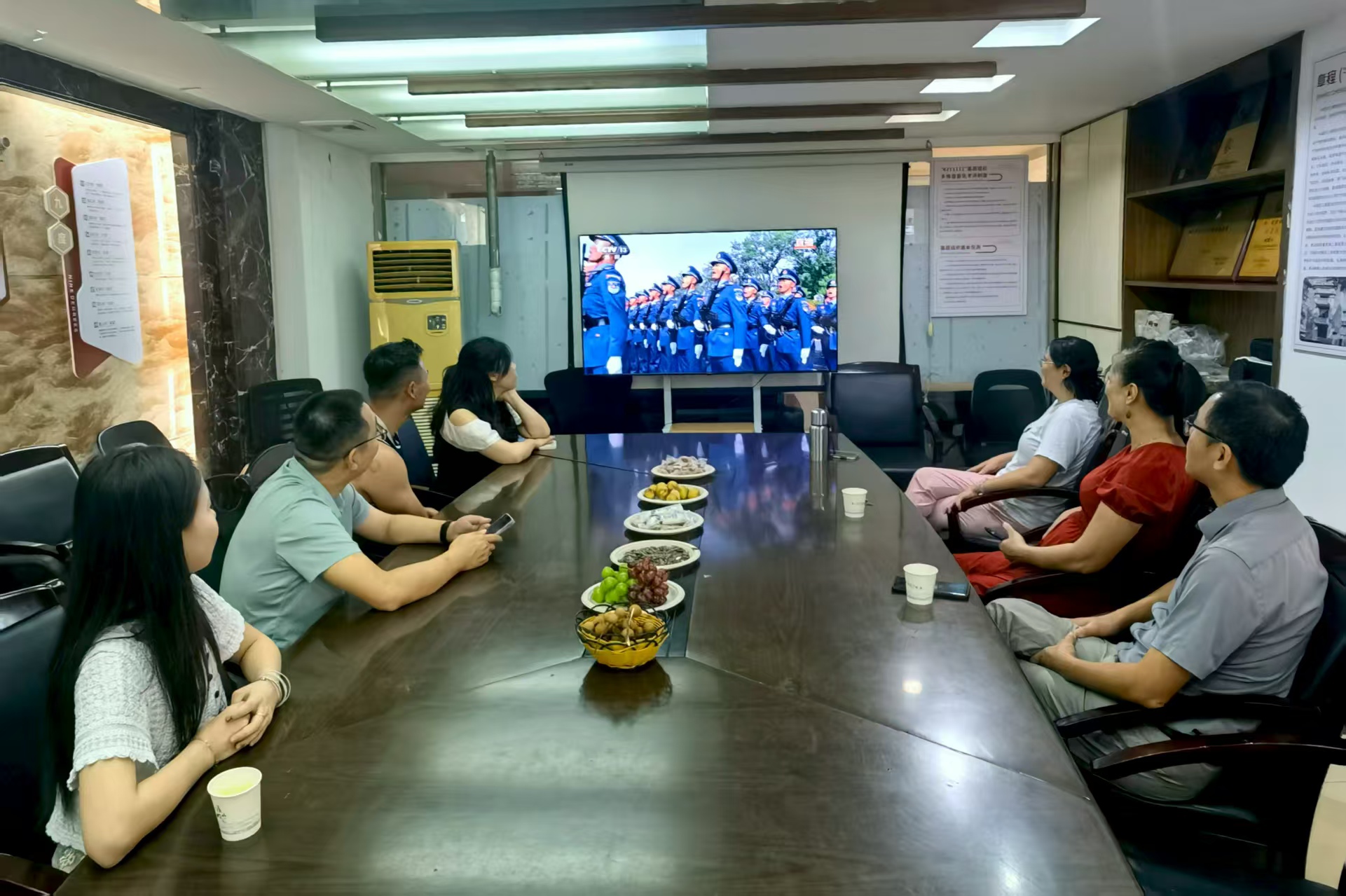2025年9月3日上午9点,在华大街道商会会长单位的会议室里,一场意义非凡的观看活动正在进行。华大街道商会党支部组织会员们一同观看纪念中国人民抗日战争胜利80周年阅兵活动,会长胡福荣、副会长翁飞、吴棋凤以及副秘书长王伙英等十来个会员齐聚于此。